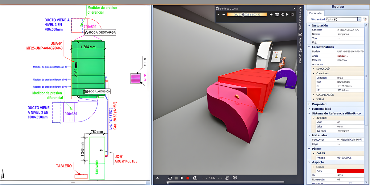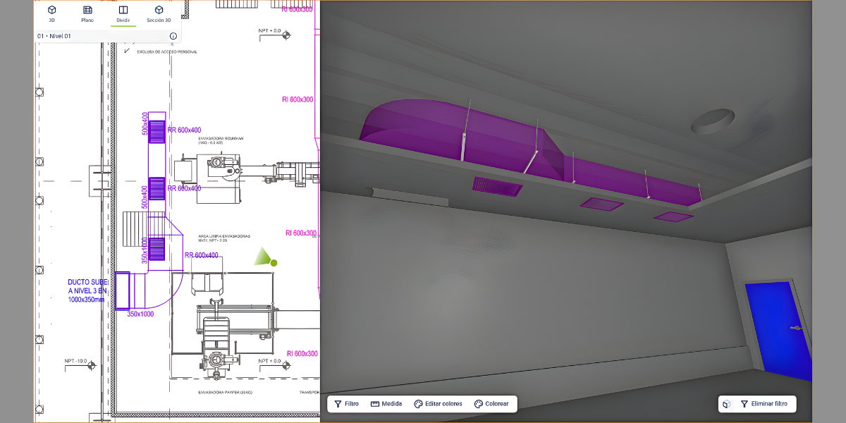 El desarrollo incluyó además el suministro de aire exterior al área de envasado, con filtración y redes de ductos verticales y horizontales, junto con ductos de inyección y retorno, cañerías de refrigeración, redes de condensado, elementos de distribución de aire y control asociado. Las condiciones de diseño consideradas en las especificaciones fijan temperaturas interiores de 24 °C en verano y 20 °C en invierno, con ventilación de referencia de 6 renovaciones por hora para bodegas, reforzando el carácter técnico e industrial del proyecto.